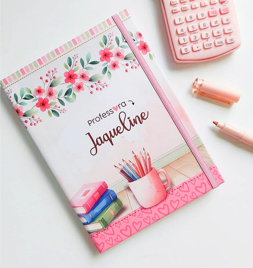 - Capa dura personalizada com a arte da campanha + nome do professor